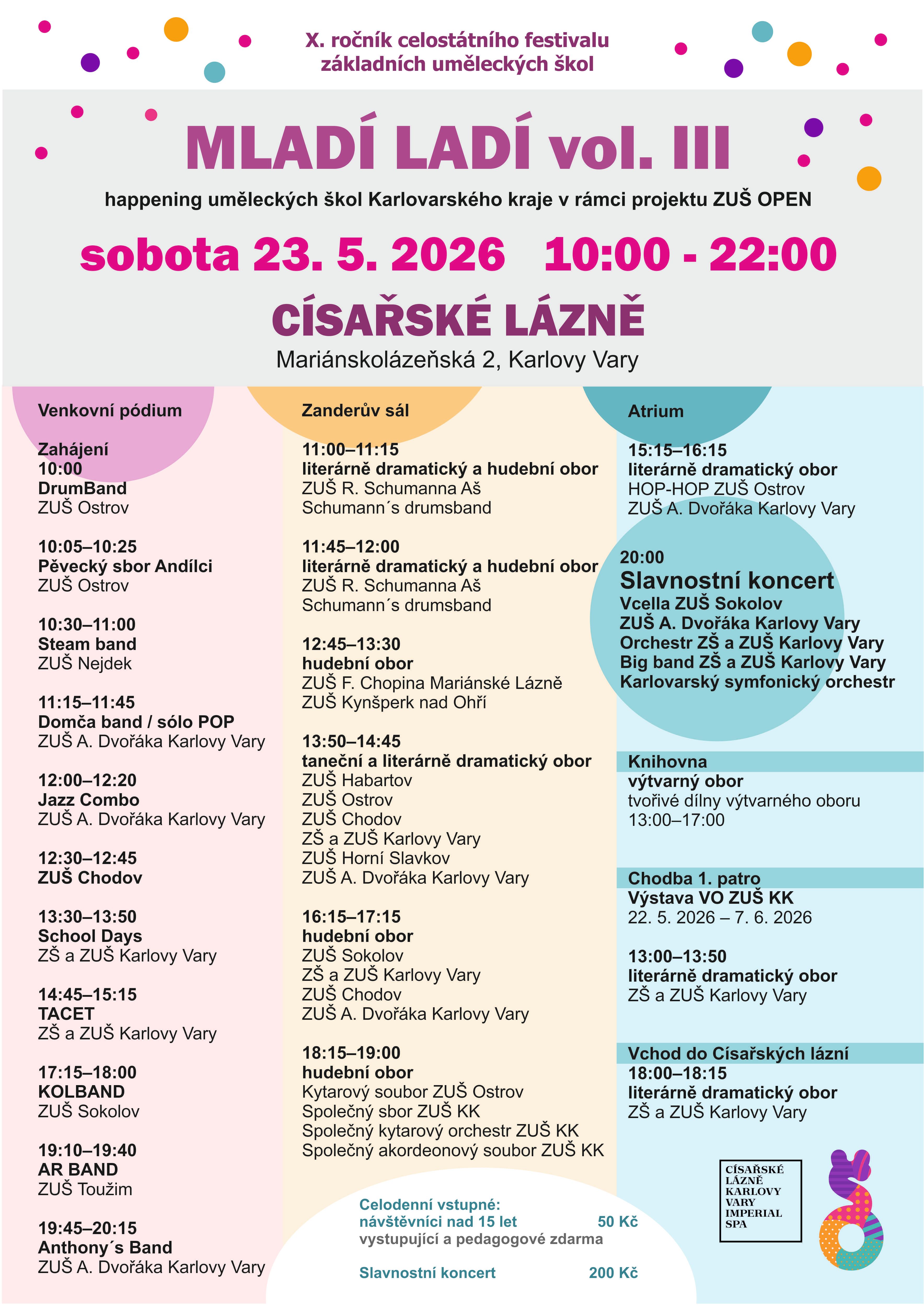 Srdečně vás zveme na X. ročník celostátního festivalu základních uměleckých škol, který se letos uskuteční v jedinečných prostorách Císařských lázní. Od 10:00 do 22:00 na vás čeká pestrý program, ve kterém se představí mladí talentovaní umělci z celého Karlovarského kraje. Do festivalového happeningu se zapojilo celkem 18 základních uměleckých škol. Přijďte si užít den plný umění a podpořit mladé nadějné talenty! Program bude rozprostřen do několika scén – venkovní pódium, Zanderův sál, Atrium, knihovna – a nabídne: · koncerty hudebních souborů a orchestrů · taneční a divadelní vystoupení · výtvarné dílny pro veřejnost a výstavu žáků ZUŠ Karlovarského kraje · site-specific performance a zapojení netradičních prostor Zlatým hřebem dne bude slavnostní večerní koncert za účasti violoncellového souboru Vcella, Orchestru ZŠ a ZUŠ Šmeralova, Big Bandu Šmeralka a Karlovarského symfonického orchestru. Patronem akce je již třetím rokem Zbyněk Drda. Akce se koná pod záštitou hejtmana Karlovarského kraje Mgr. Petra Kubise a primátorky Karlových Varů Ing. Andrey Pfeffer Ferklové, MBA. Více viz. plakát akce.